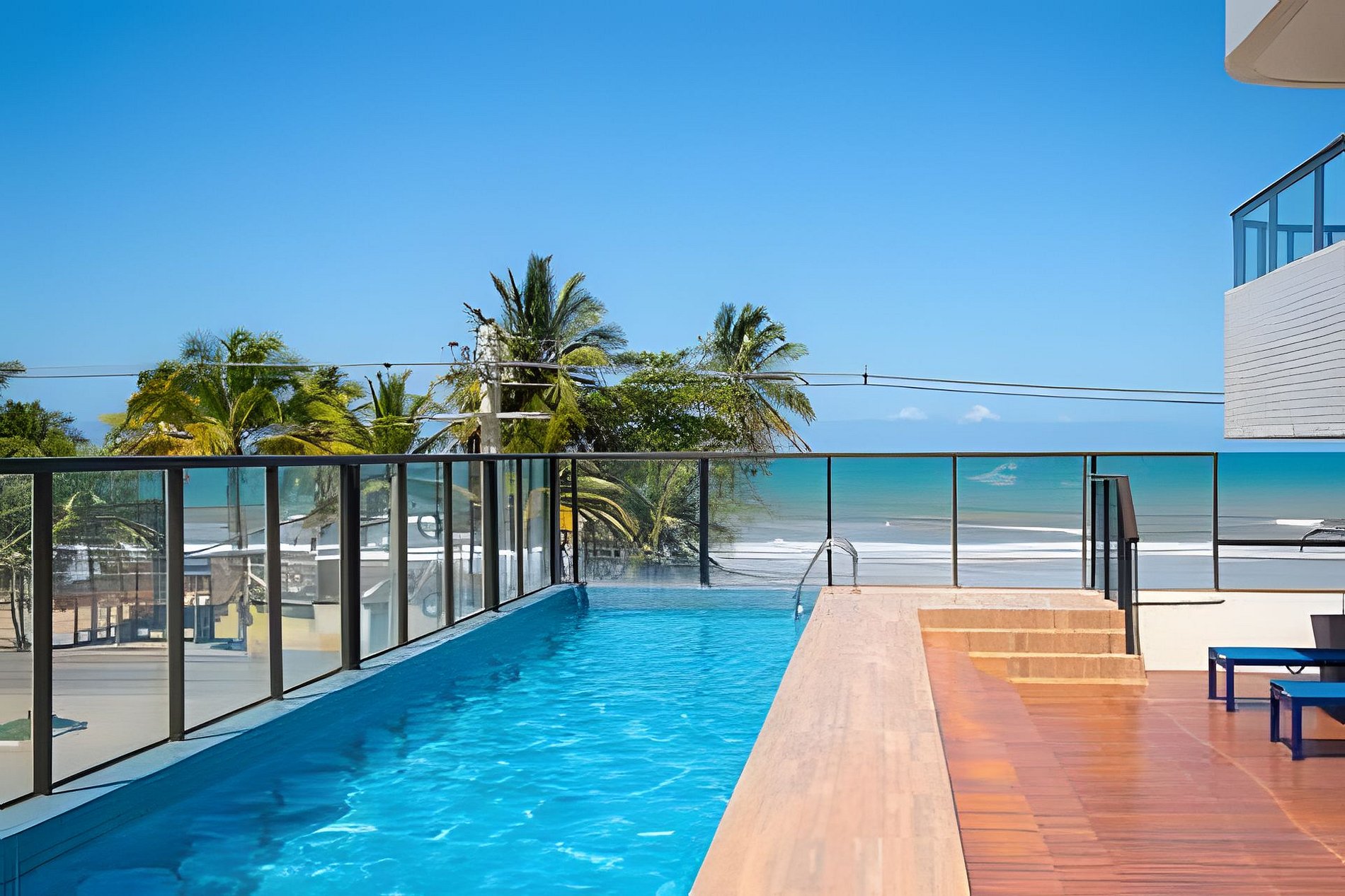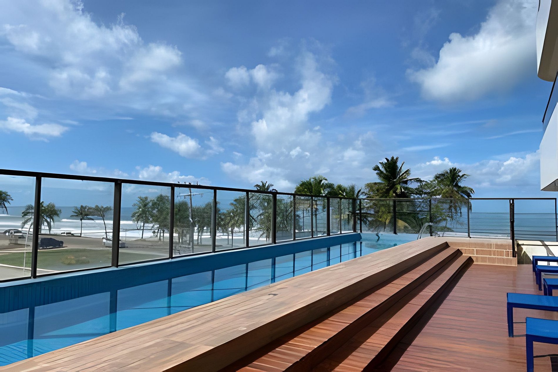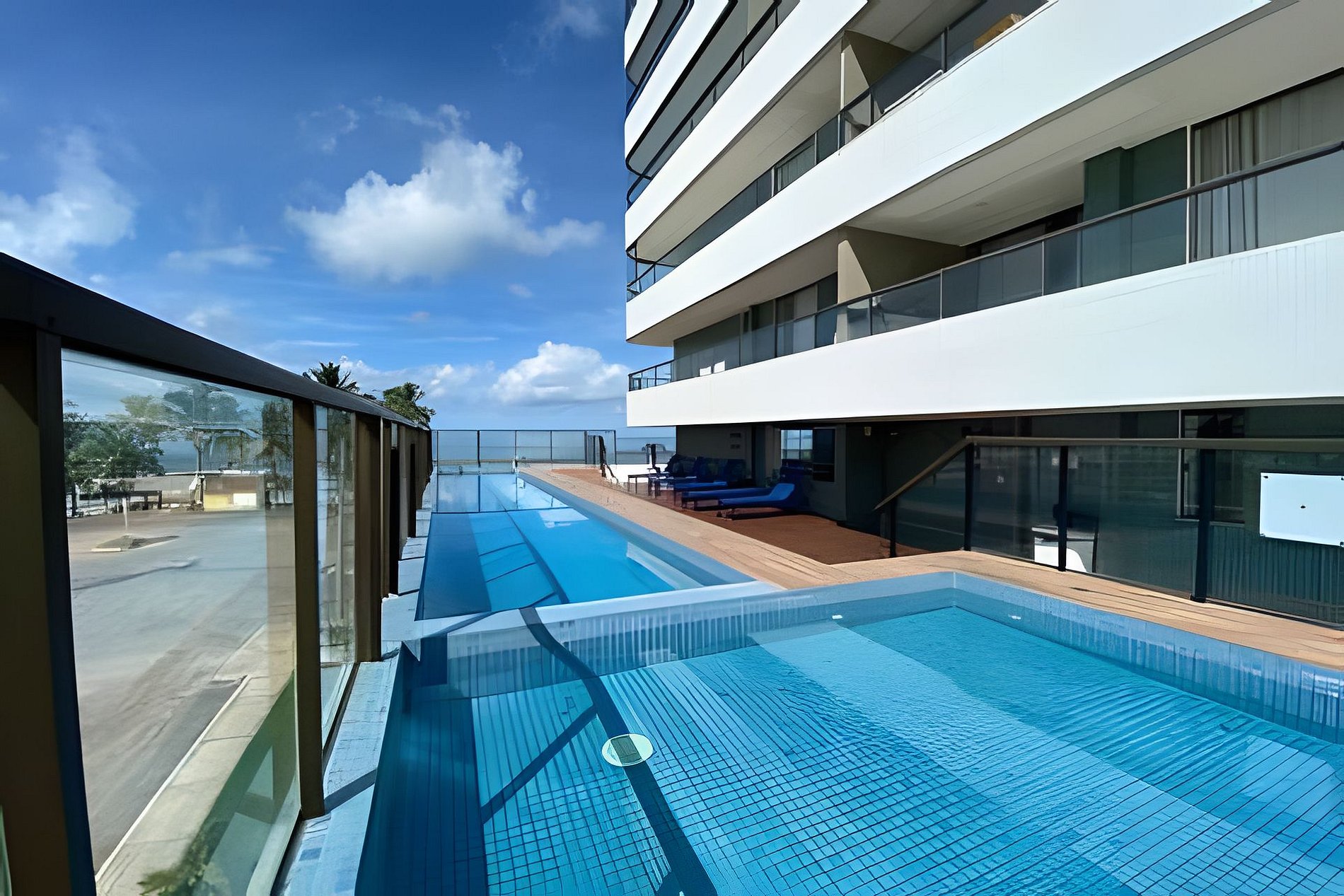 Apto de luxo com ELEVADOR PANORÂMICO e VISTA MAR na Praia dos Milionários, Ilhéus. A 10 metros da praia e próximo à rodoviária e à Catedral de São Sebastião. Conta com varanda, Wi-Fi gratuito, ar-condicionado nos 2 quartos, cozinha equipada (geladeira, air fryer, cooktop, cafeteira, jogo de panelas), 2 banheiros, 3 TVs (65/55/50 Po), brinquedoteca, salão de jogos (ping pong, sinuca, xadrez), academia completa, sauna, piscina ao ar livre e estacionamento privativo gratuito.